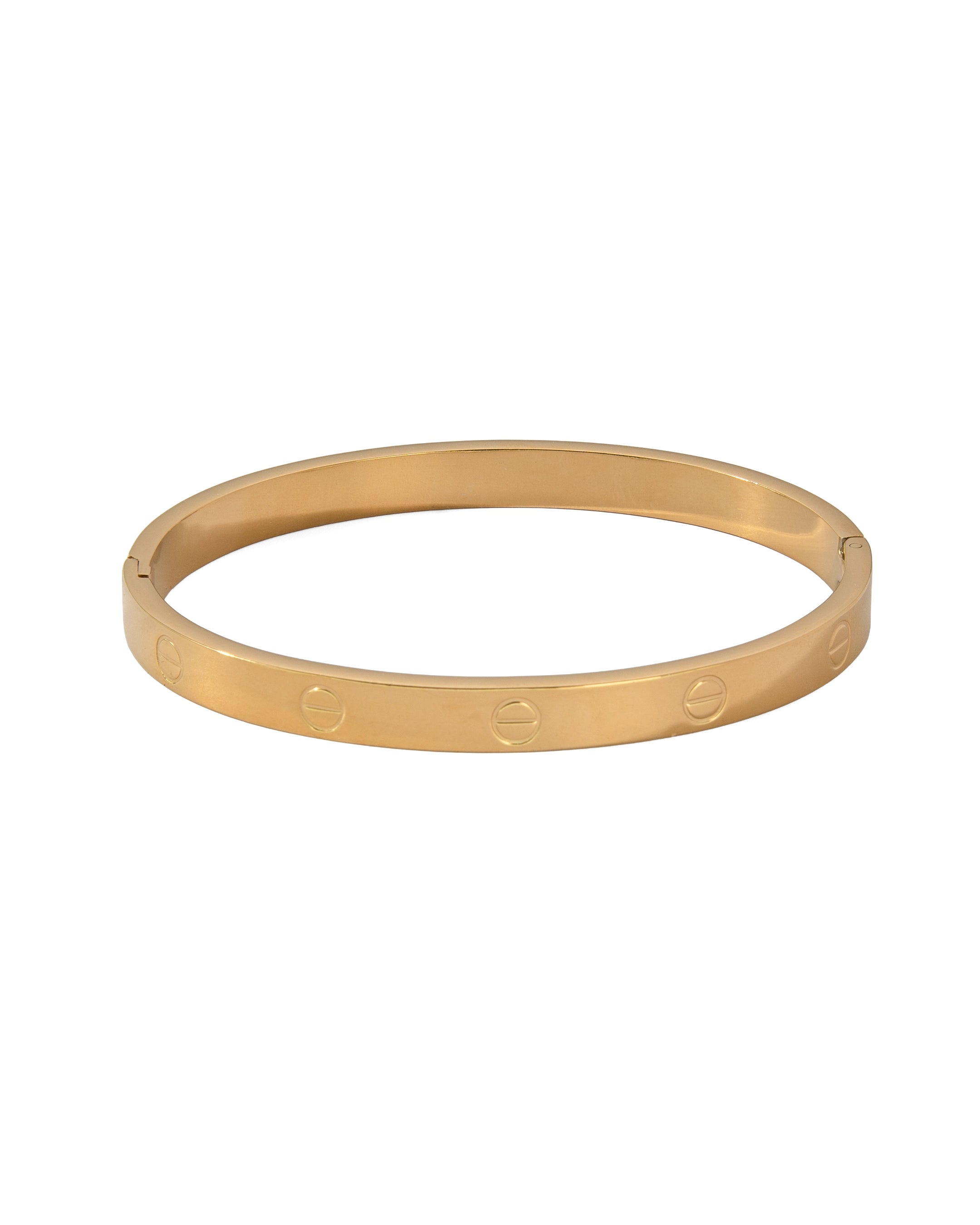 - Tasarım: Pürüzsüz gold yüzey üzerine işlenmiş ikonik vida başı motifleri ile karakterize edilen, lüks ve zamansız bir tasarıma sahip kilitli kelepçe bileklik.