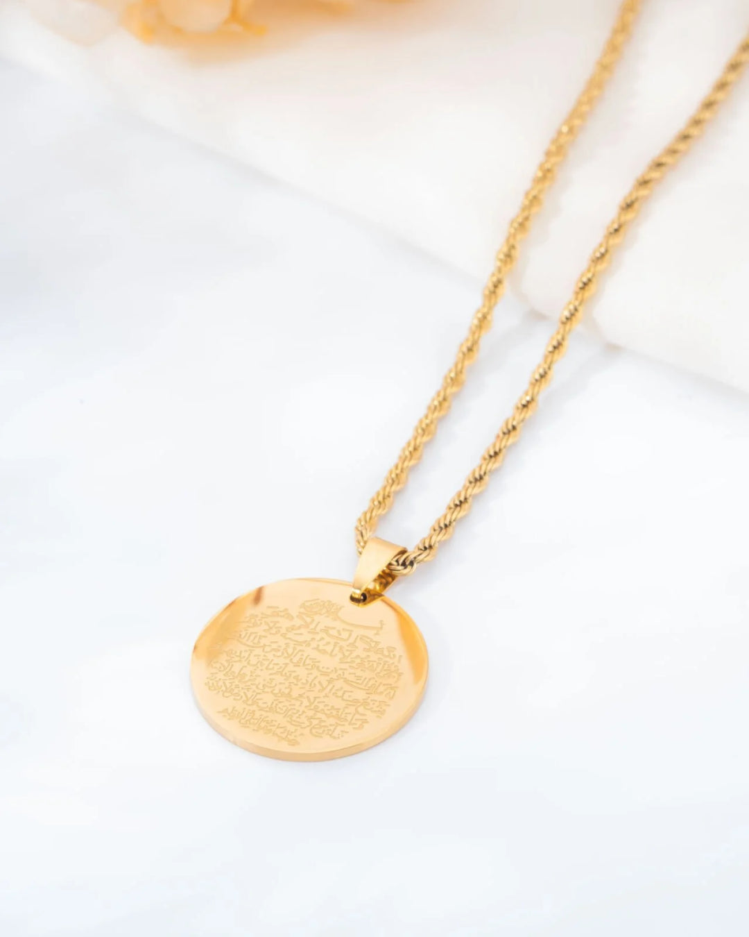- Tasarım: Üzerinde hassas lazer işleme tekniğiyle Ayetel Kürsi duası kazınmış, yüksek parlaklıkta altın renkli yuvarlak madalyon uç ve ona eşlik eden şık burgu (halat) zincir tasarımı.