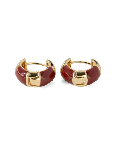 - Tasarım: Parlak bordo mineli yüzey ile gold metalik detayların birleştiği, retro-modern toka figürlü halka küpe tasarımı.